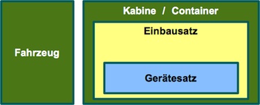 Dem Einbausatz (EBS) sind alle erforderlichen Aggregate, Anbauten sowie Ausstattungsteile zugeordnet, welche die Halterung, die Funktion und den ordnungsgemäßen Betrieb des Gerätes oder Gerätesatzes innerhalb der Kabine/des Containers ermöglichen. Hierzu gehören auch Teile für die Energie- und/oder Informationsübertragung sowie der Klimatisierung, die nicht über den Gerätesatz bereitgestellt werden.